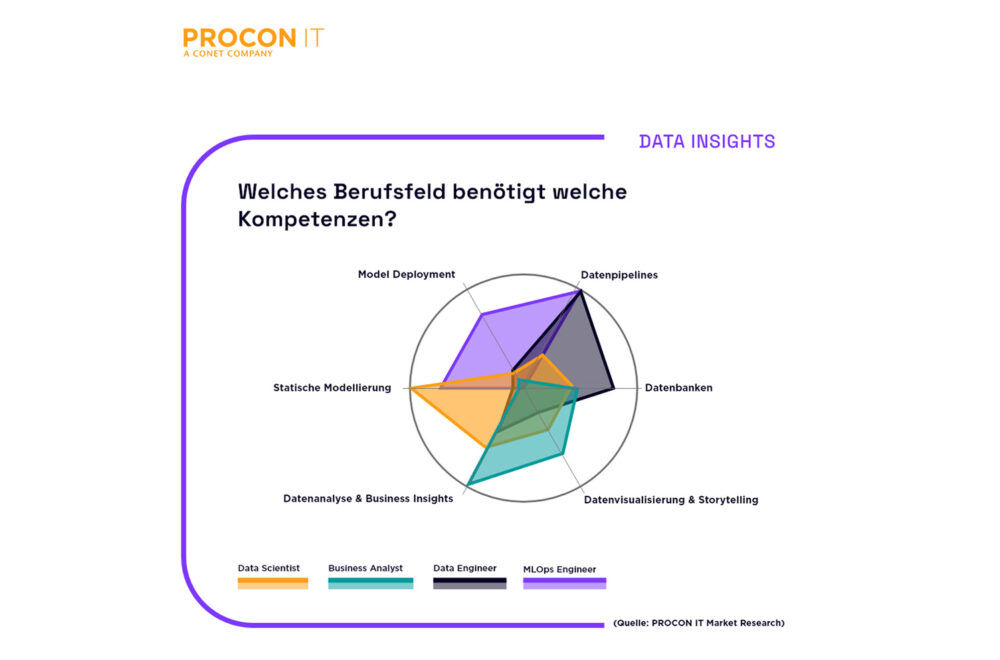 PROCON Data Insights hat einzelne Technologien wie „SQL“ oder „scikit-learn“ zu Kompetenzfeldern wie „Datenbanken“ oder „Statistische Modellierung“ zusammengefasst und mit Stellenausschreibungen zu verschiedenen Rollen aus den letzten 12 Monaten abgeglichen.